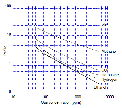縱坐標(biāo)表示傳感器電阻比 Rs/Ro,Rs與Ro的定義如下:
