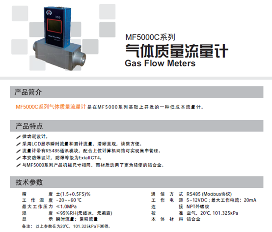 一、MF5000系列Siargo矽翔流量計(jì)產(chǎn)品簡(jiǎn)介: Siargo矽翔MF5000系列氣體質(zhì)量流量計(jì)是矽翔微機(jī)電系統(tǒng)有限公司結(jié)合微機(jī)電系統(tǒng)(MEMS)流量傳感芯片技術(shù)和計(jì)算機(jī)自適應(yīng)技術(shù)歷經(jīng)多年,開發(fā)出的智能化全電子式氣體質(zhì)量流量?jī)x表,主要技術(shù)性能處于高水平,具有高靈敏度、高精度、大量程比等特點(diǎn);針對(duì)工業(yè)環(huán)境,融合了多種抗干擾措施的電磁兼容設(shè)計(jì);且具有多種信號(hào)輸出,能通過通訊接口實(shí)現(xiàn)網(wǎng)絡(luò)管理功能;本產(chǎn)品在性能、安裝和維護(hù)方面也具有其獨(dú)特的優(yōu)越性,可廣泛應(yīng)用于石油、燃?xì)狻⒒?、冶煉、能源等各個(gè)領(lǐng)域。