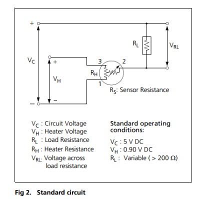 Fig2展示了此產品的標準使用電路。傳感器阻值(Rs)的變化導致了負載電阻(RL)上的電壓的變化。為了獲取最佳的性能和參數,加熱電壓(VH),電路電壓(Vc)和負載電阻(RL)的值必須在給定的標準操作條件下的值,具體參數表在下一頁表述。