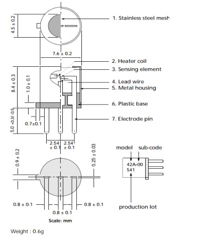 SB-42A是SnO2半導體氣體傳感器,對HCFS(如氟利昂R134a)有高靈敏度并且提高了抗其他氣體干擾的能力。此產品適合制冷劑氣體R134a,R-410a,R-407c的泄漏檢測。由于此產品的低功耗(120mW)特點,非常適合便攜式設備。 結構 氣體感應半導體材料是小珠子的類型,加熱線圈和電極線嵌入在元件中。敏感元件安裝在金屬封裝內,此封裝是用可以空氣流通的雙不銹鋼網眼制成。此網眼具有防爆特性(Fig1)。