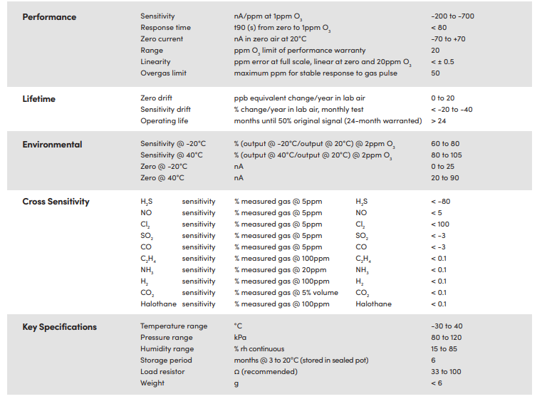 英國Alphasense O3傳感器 臭氧傳感器?O3-AH參數(shù):
