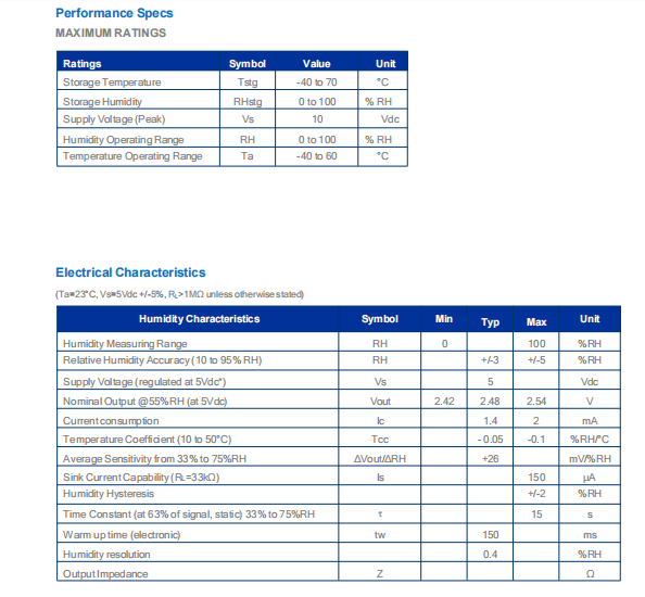 韓國Samyoung 濕度傳感器模塊 HW2200 參數(shù):