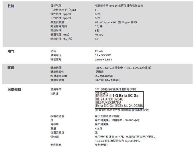 英國(guó)Alphasense VOC 光電離子傳感器 高級(jí)PID傳感器 – PIDX-A-020 參數(shù):