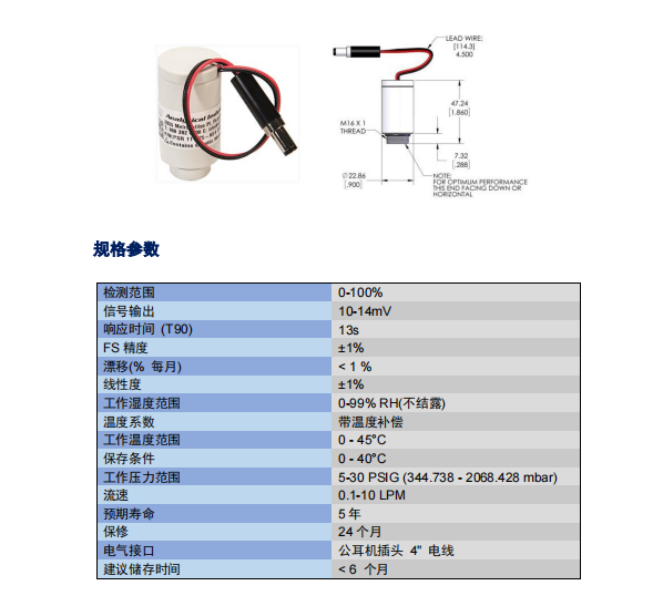 美國AII O2 氧氣傳感器?PSR-11-75-KE4? 參數(shù):