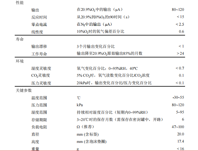 英國Alphasense 氣體傳感器 氧氣傳感器 O2 O2-W2 參數(shù):