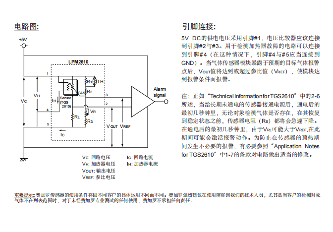 關(guān)于傳感器的靈敏度特性請參見“Technical Information for TGS2610”,有關(guān)電路設(shè)計(jì)進(jìn)一步的信息請參見“Application Notes for TGS2610”。
