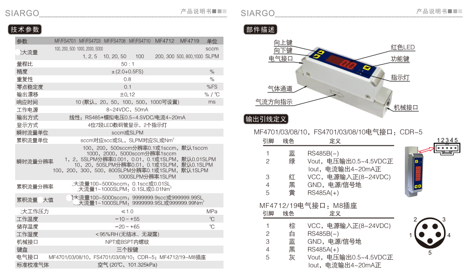 美國(guó)Siargo 氣體質(zhì)量流量計(jì) MEMS流量傳感芯片 LED顯示屏 MF4700系列 參數(shù):