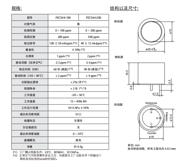 日本figaro 用于檢測低濃度氨的氣體傳感器 FECS44-200  參數(shù):